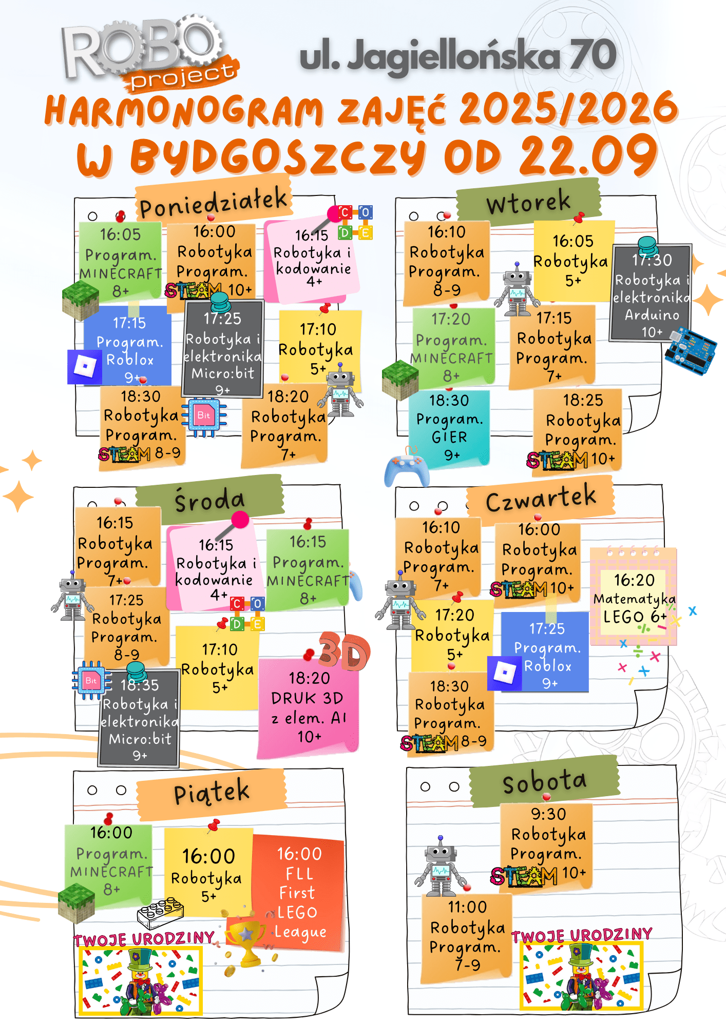 ROBOproject to coś więcej niż tylko projektowanie, budowanie i programowanie robotów. To już 12 rok prowadzenia uwielbianych przez dzieci zajęć edukacyjnych w Bydgoszczy i okolicach. Pierwsze zajęcia odbyły się w bydgoskich szkołach i przedszkolach. Obecnie możemy pochwalić się najnowocześniejszą placówką edukacyjną w regionie, gdzie rozwijamy nasz autorski program zajęć pozalekcyjnych przybliżających dzieciom takie dziedziny wiedzy jak mechanika, robotyka, elektronika, informatyka. Prezentowana przez nas forma zajęć pozwala przenieść dzieci w magiczny świat nauki. Nie mamy wątpliwości – podczas zajęć z robotami dzieci przełamują swoją niechęć do matematyki i fizyki. To naszym zadaniem jest, aby oswoić najmłodszych z naukami ścisłymi, przekazując odpowiednimi metodami wiedzę i przybliżyć perspektywy zawodu inżyniera. Nasze pociechy nie wiedzą jeszcze jaki kierunek obiorą w przyszłości. Czujemy satysfakcję i wiemy, ze odnieśliśmy sukces, gdy dziecko na zadane pytanie co chciałoby robić w przyszłości, bez wahania odpowiada – BUDOWAĆ ROBOTY!